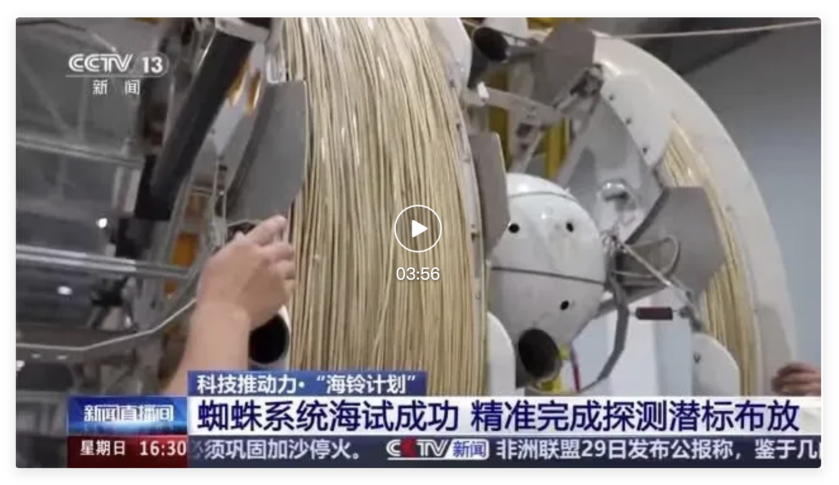 据介绍,“海铃计划”中每一根长700米的探测潜标就要串起20个探测球舱。整个项目计划放置1000个左右探测潜标,这个巨大工程需要一个安全高效的布放装置。研究团队从蜘蛛吐丝的连续性与可控性中获得灵感,研发出了蜘蛛系统,在前不久刚刚完成的海试中,正是这个蜘蛛系统完成了对潜标的精准布放。我们继续去实验现场看一看。